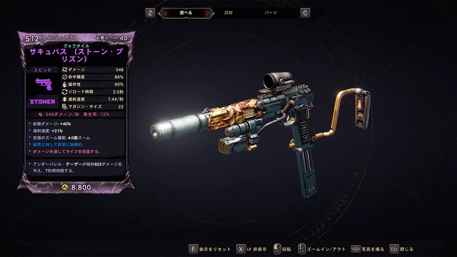 ワールドドロップのストーカー製ピストル。コモンからエピックまでのランダムなレア度でドロップし、レア度が高いほどステータスやパーツの数に優れる。