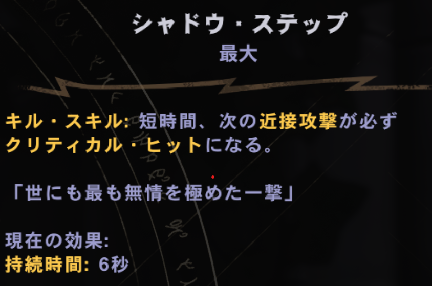 いくら近接ダメージを上げてもクリティカルが出ないとステータス効果は確率でしか発生しません。そこで重要になるのが同じくスタボマンサーのスキルの以下2つです。確定クリティカルなので100%ステータス効果ダメージが発生するようになります。