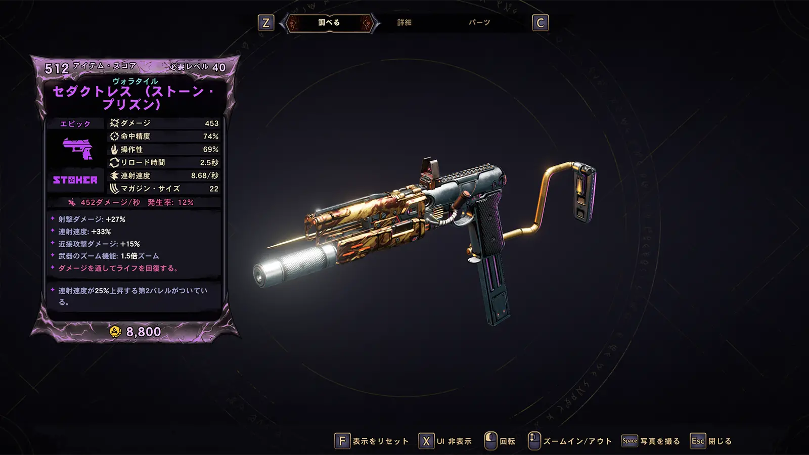 ワールドドロップのストーカー製ピストル。コモンからエピックまでのランダムなレア度でドロップし、レア度が高いほどステータスやパーツの数に優れる。