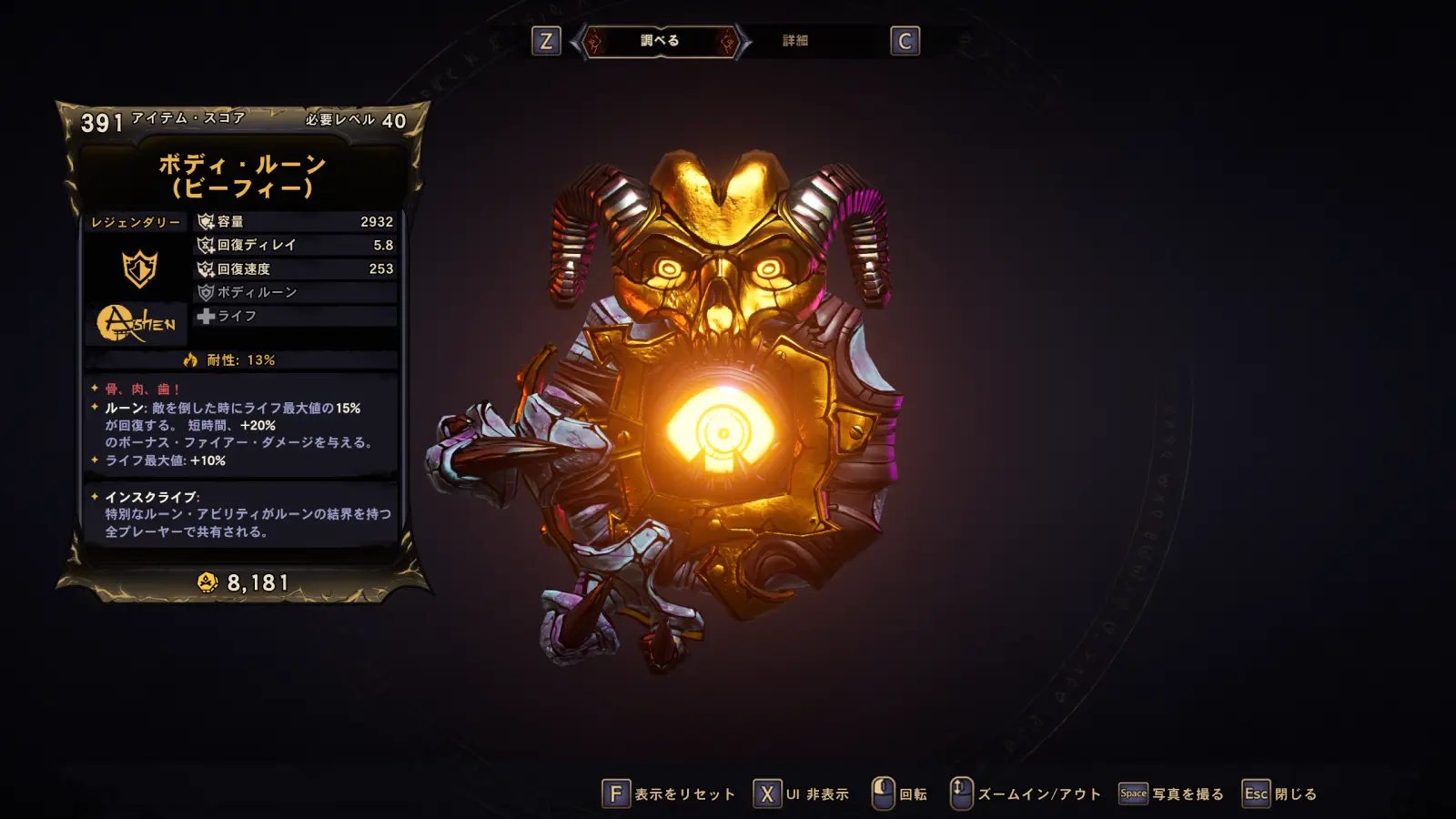 ルーン・アビリティ:敵を倒したときにライフ最大値の15%が回復し、短時間、+20%ボーナス・ファイアー・ダメージを与える。