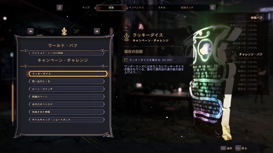 各キャンペーン・チャレンジの進行状況はオーラ・メニューの日誌タブから「ワールド・バフ」の項目を選択すると確認でき、ロケーションごとの目標数や達成率等は該当ロケーションをマップで表示すれば確認できる。