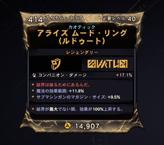 アイテムがカオス・ランク付きである場合、アイテムカードの名称部分上部に水色の文字でランクが表示される。