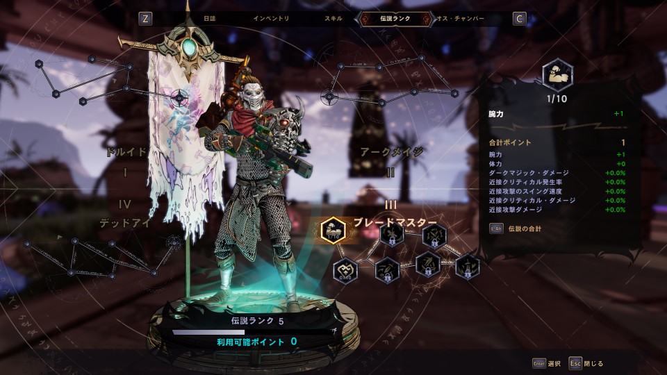 伝説ランクの経験値バーが最大になると伝説ポイントが1つ貰え、これを新たに利用可能となる4つのマスタリーのノードに割り振ることで、伝説ランクとステータスを上げることができる。