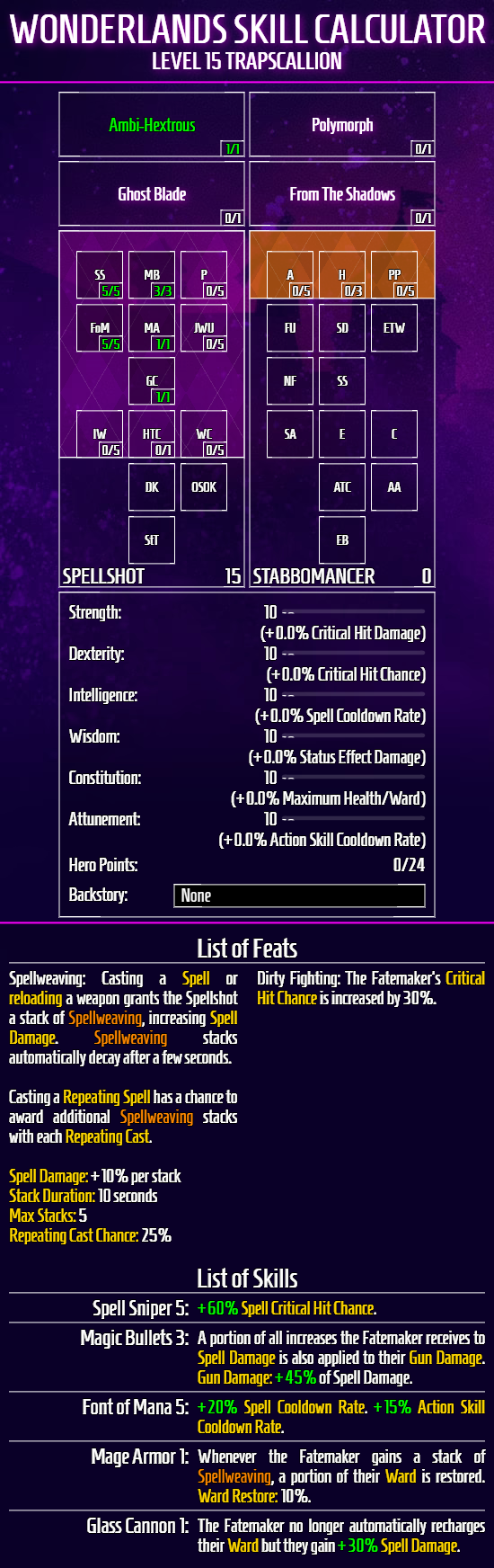 スペルショットのアクションスキル「アンビ・ヘクストロス」で魔法を二つ装備するビルド。クラス特性スペルウィーブでリロードと魔法使用のたびに、魔法威力が向上する。