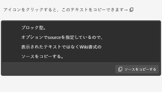コピー用のアイコンやボタンを表示し、それをクリックorタップでテキストもしくはWiki書式のソースをコピーすることができる。ソースのコピーは今のところブロック型でのみ使用できる。