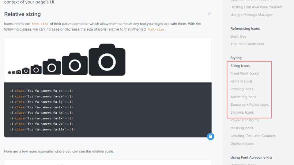 表示するアイコンはFont Awesome公式のアイコンリストから好きなものを選び、アイコンの名前かクラスを{}の中に書く。クラスで指定する場合、半角スペースで区切ってオプション用クラスも一緒に指定することができる。