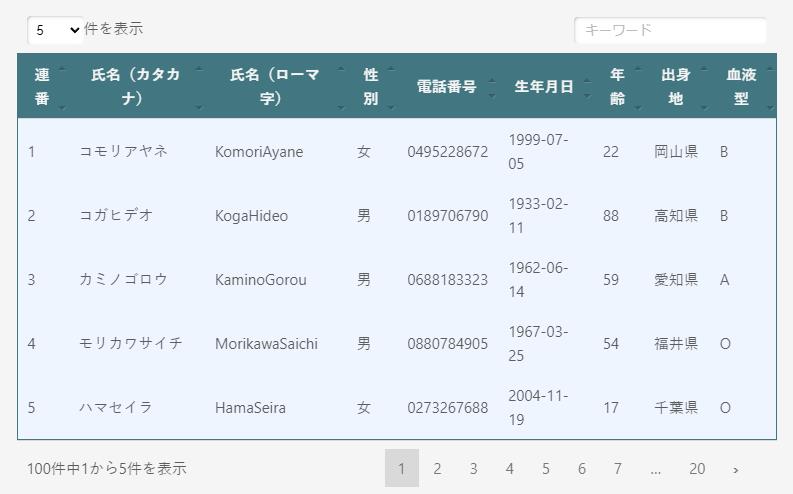 | 連番 | 氏名(カタカナ) | 氏名(ローマ字) | 性別 | 電話番号 | 生年月日 | 年齢 | 出身地 | 血液型 |