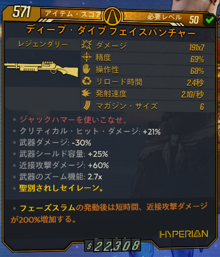 与えた近接攻撃ダメージの75%分を回復する「ナイフ・ドレイン」がついていれば何でもいいが、中でもレジェンダリーの「スタティック・チャージ」が使いやすい。