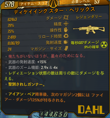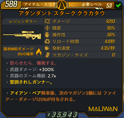 精度はとても良いがスナイパーライフルとして使うのは絶望的。発射レートも低くサム・フォー・ザ・ロードでの運用も考えられない。そのため使うとしたら唯一褒められる精度を捨ててショットガンモードで接近して弱点にぶち込む運用になる。火属性に火マガ125%を付けてHPが生身のみの敵に対して使うならダメージも通るがクラカタウを差し置いて使う意味を1mmも感じられない。