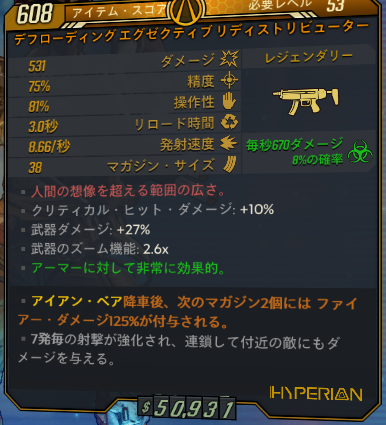 マガジンを10発以上まで拡張してやると連射が効かないため割と撃ち続けられます。使用感は兎に角火力不足。敵集団にダメージをばらまくのは楽しいのですが、如何せんアーマーの敵が辛すぎます。