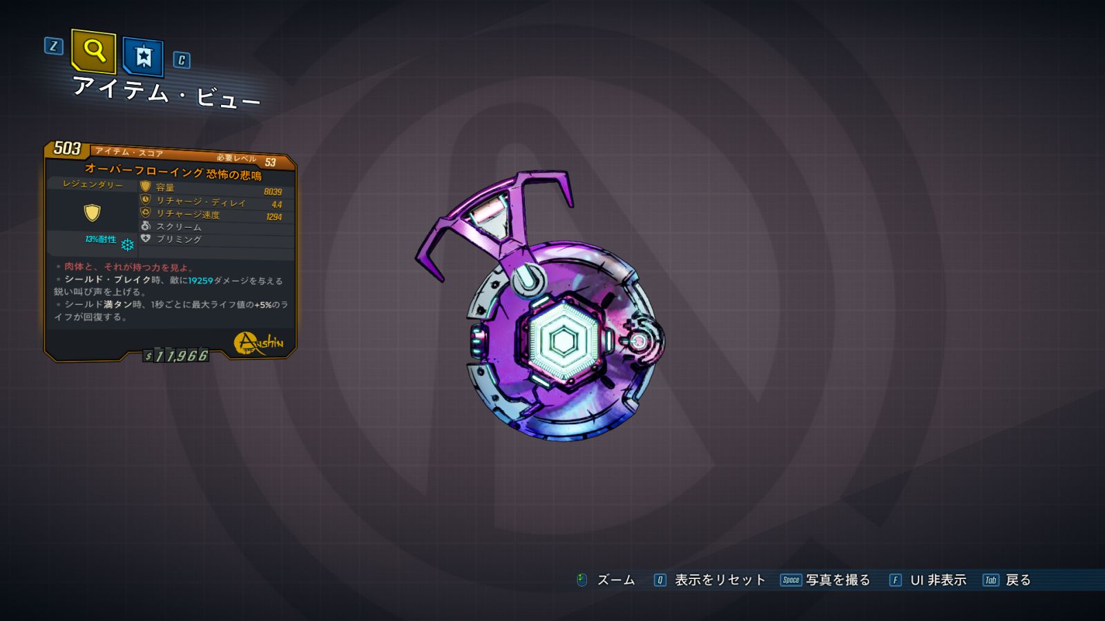 | ・シールド・ブレイク時、敵に14872ダメージを与える鋭い叫び声を上げる。 ・シールド満タン時、1秒ごとにライフ値の+5%のライフが回復する。 |
