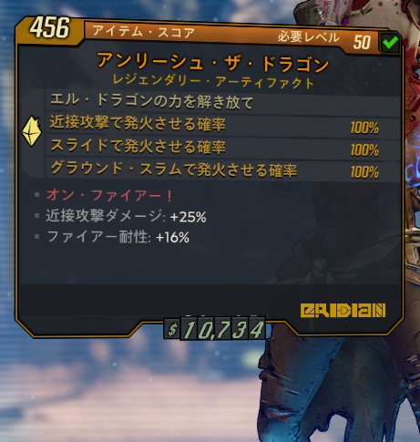 | アーティファクト | アンリーシュ・ザ・ドラゴン (近接+25%, ファイアー・ダメージ +16%が理想) |