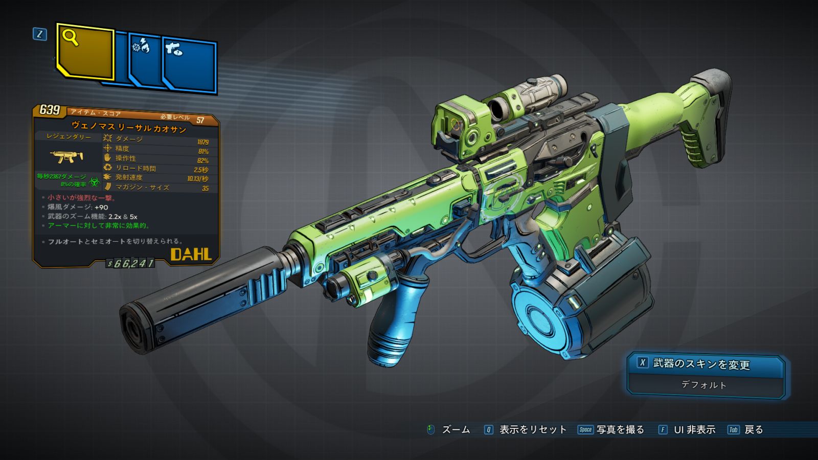 | Part_SM_DAL_Barrel_Kaoson | 爆風ダメージ半径: +90 ダメージ: +60% | クリティカル・ダメージ: -60% レティクルの拡大: +200% | カオサン |