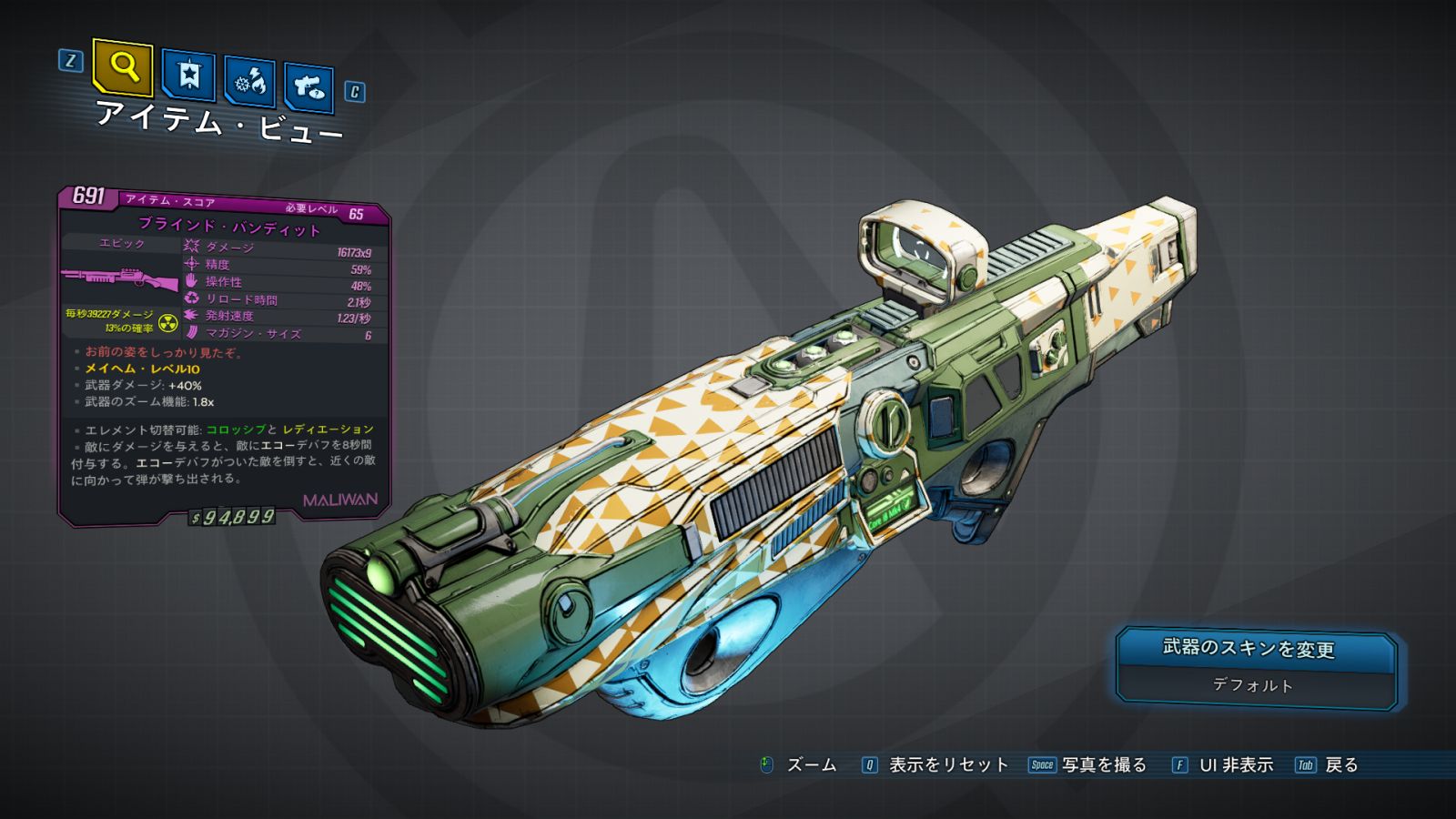 | Part_SG_MAL_Barrel_BlindBandit_Epic | 武器の揺れ: -20% ダメージ: +125% | | ブラインド・バンディット |