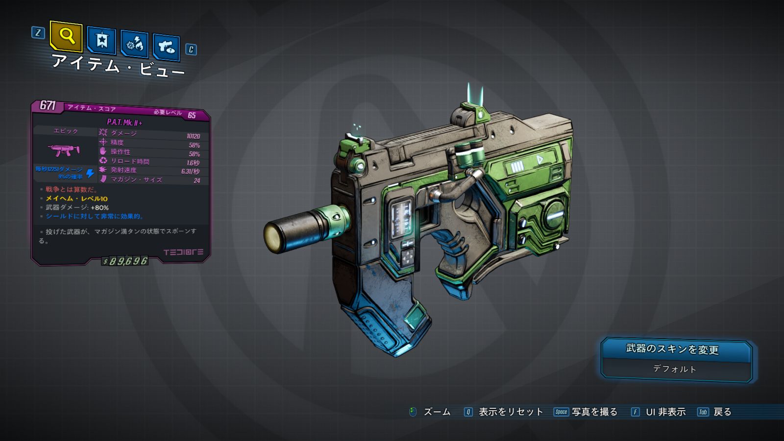カテゴリ:アイテム 武器 サブマシンガン ユニーク ティーディオール 聖別なし サイコ・クリーグ