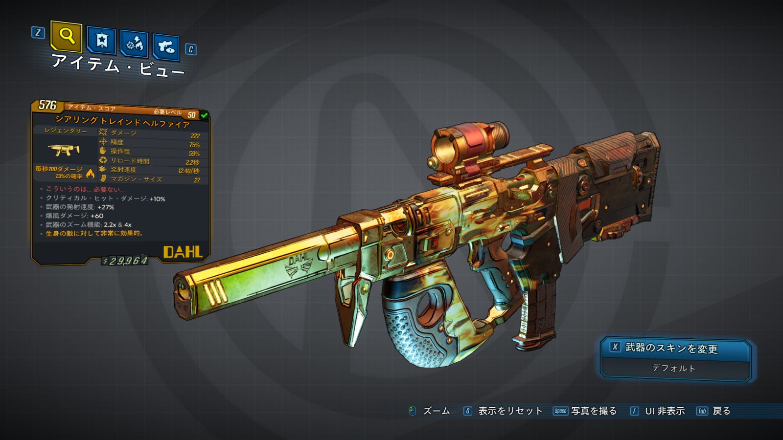| Part_SM_DAL_Barrel_HellFire | 爆風ダメージ半径: +60 エレメンタル発生確率: +200% エレメンタル・ダメージ: +275% ダメージ: +10% | | ヘルファイア |