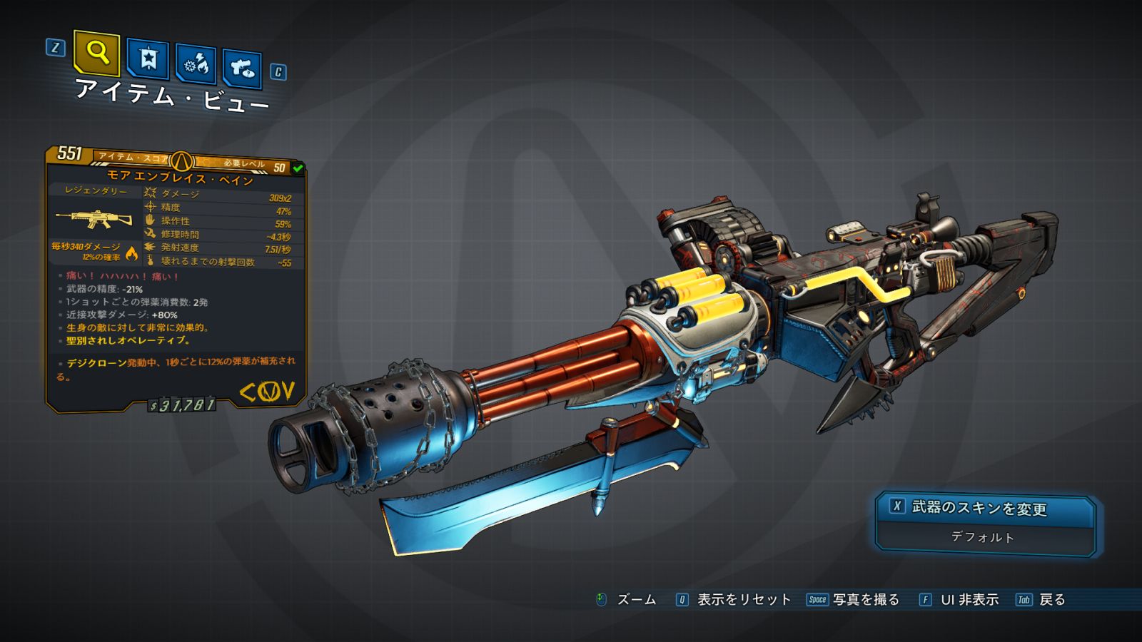 | ・マガジン・サイズ無制限だが、武器のヒートアップが続くと、破損する。 |