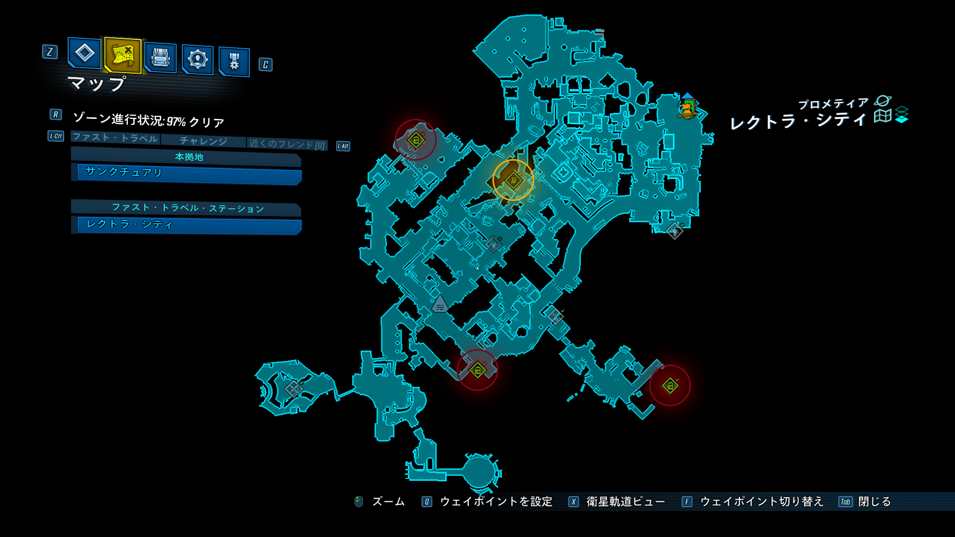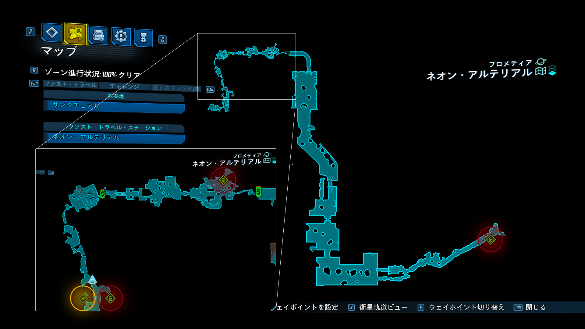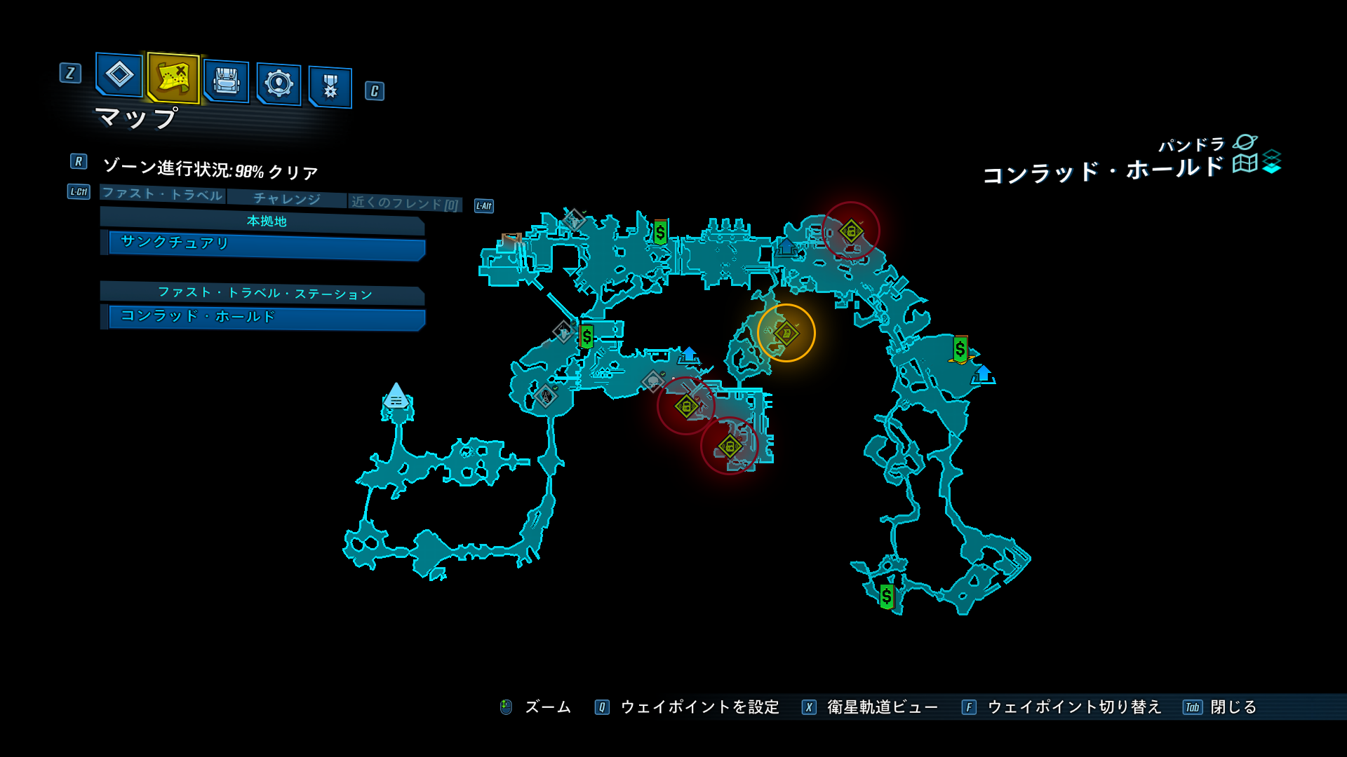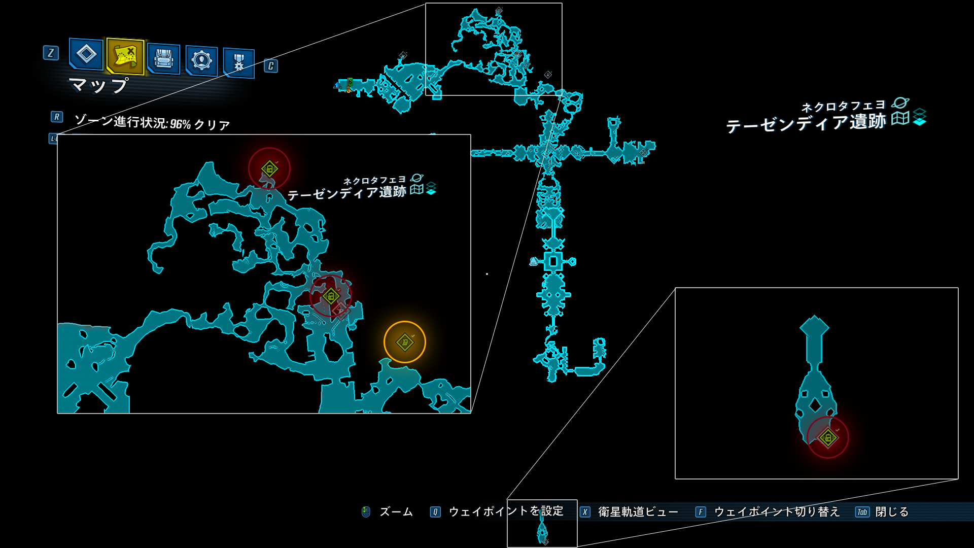 - 各ゾーンに伝説のヴォルト・ハンター「タイフォン」が残した日誌が3つあり、全て回収するとタニスがお宝の場所を割り出してロックを解除してくれる。