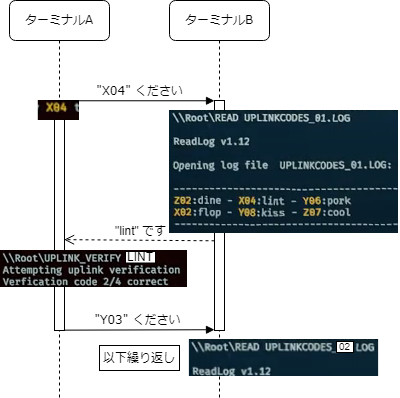 後述のコードを特定する際に使用するので、これを確認、ターミナルBのプレイヤーへ連絡する。 - ターミナルB: コード内容の確認