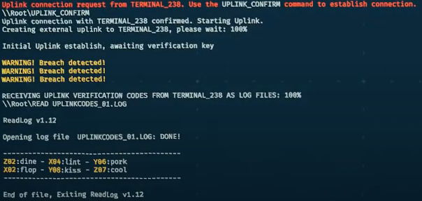 ターミナルBのプレイヤーからコードを受け取ったら、"UPLINK_CONFIRM xxxx"を入力する。