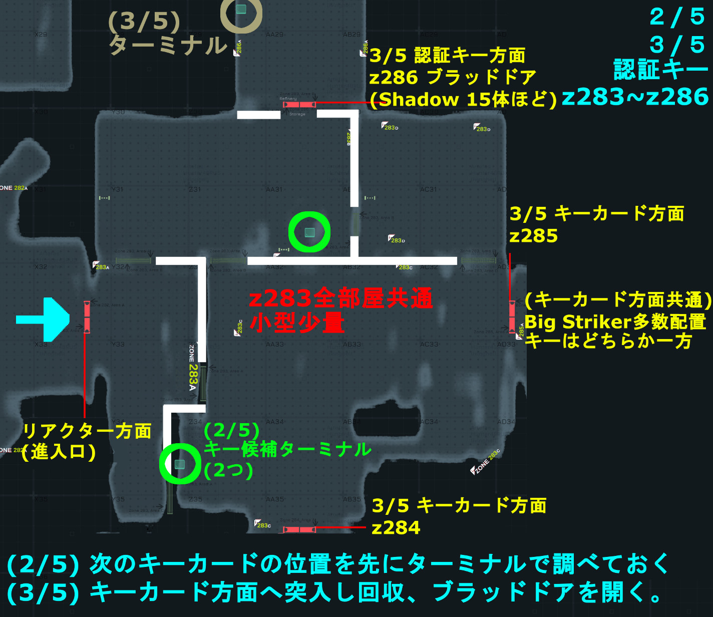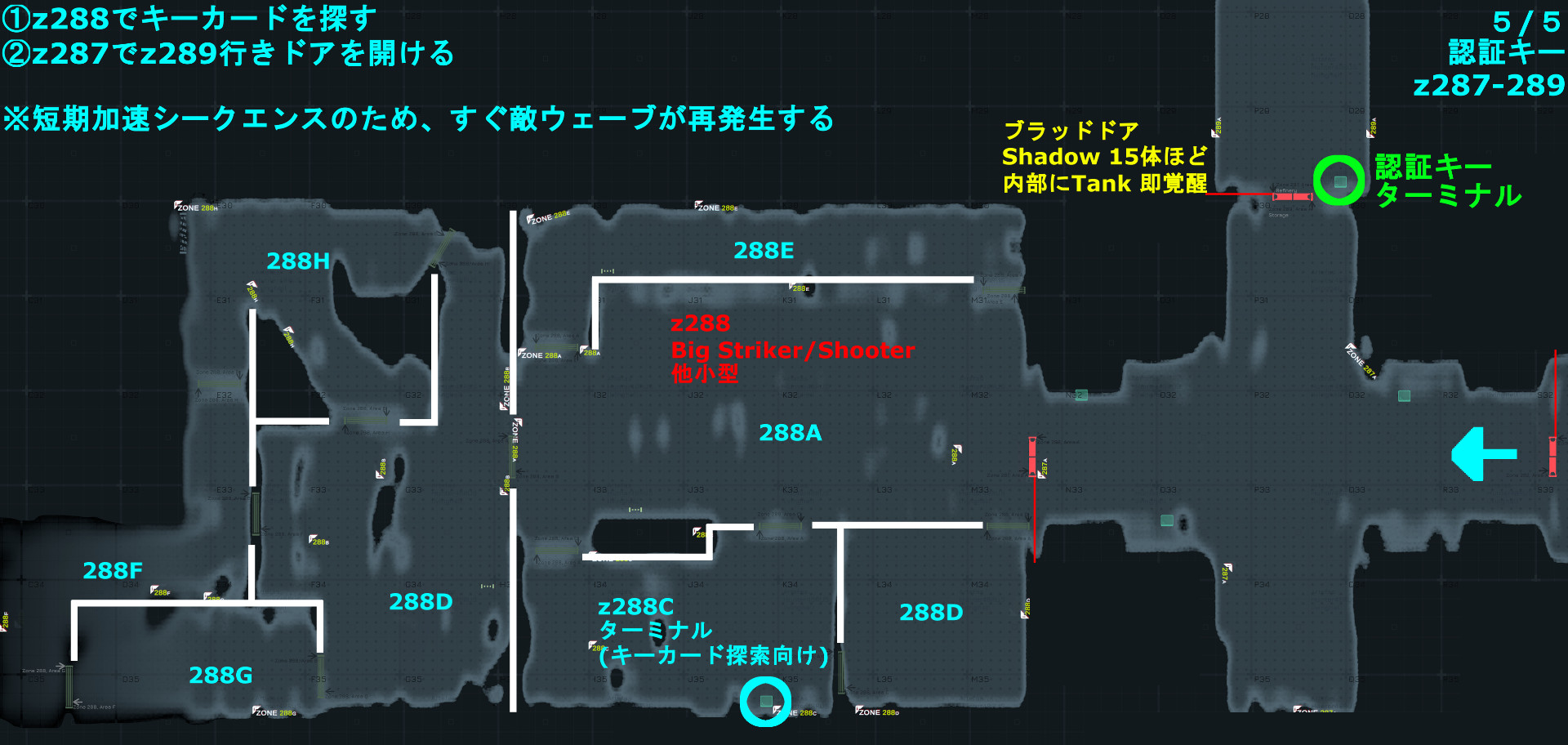 Zone283にあった3つのドアが開けられるようになる。ブラッドドアの先が認証コードの入手できるゾーンだが、キーが必要だ。他方に2つドアがあり、どちらかのゾーンにキーが配置されているので必要な方を解放しよう。内部はBig Strikerが大量に配置されている。