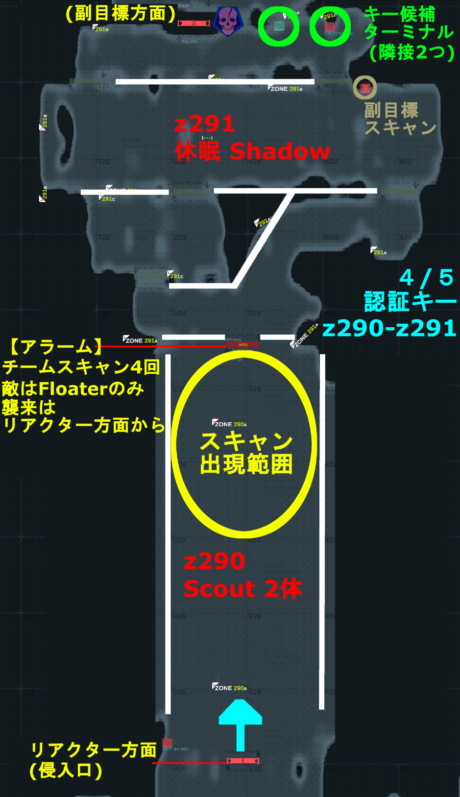 スポーン地点は必ずZone274になる。また、Zone292は主目標のTank部屋の奥にあり、ソロスキャンで侵入できる。