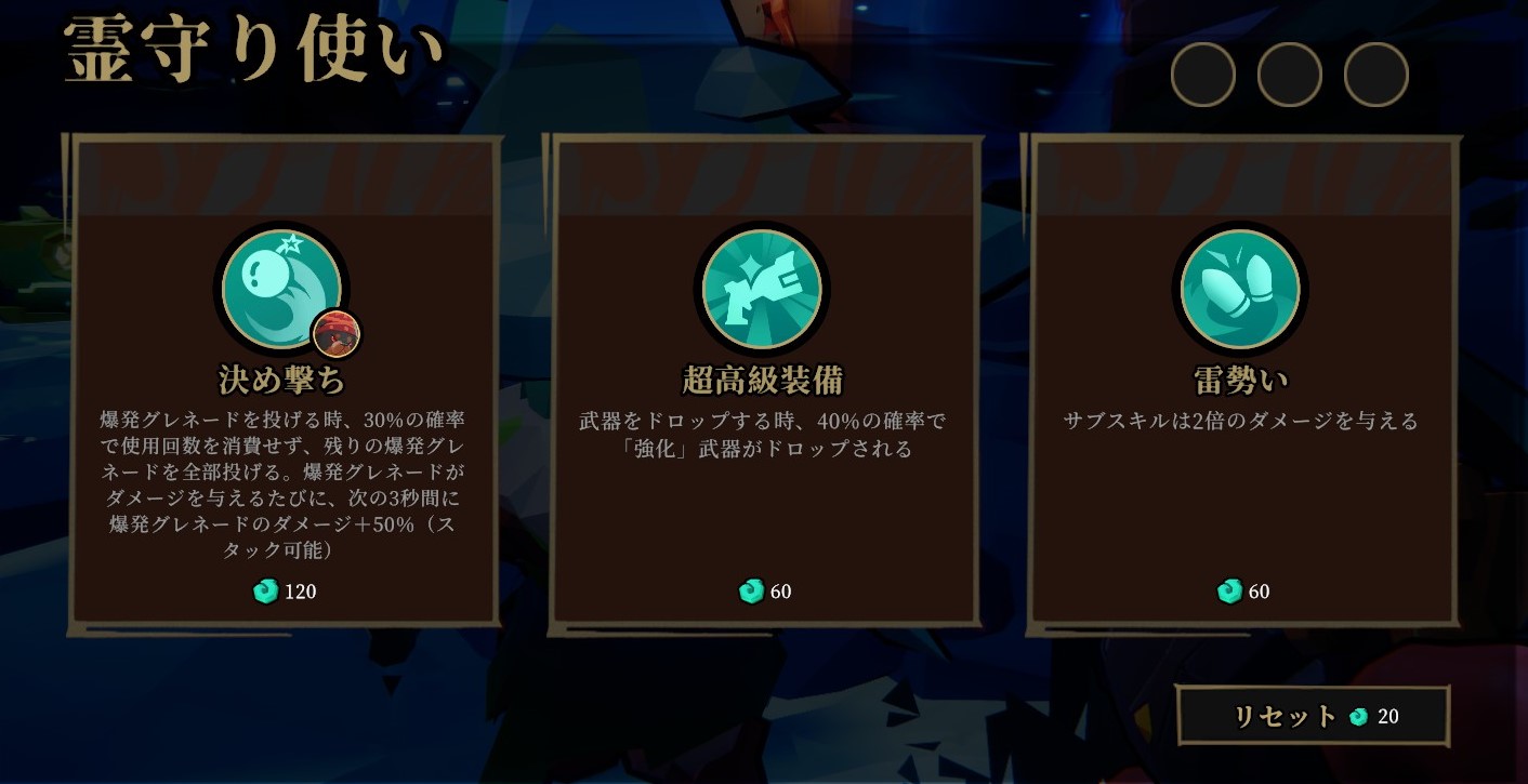 そのアドベンチャーでのみ効力を発揮する能力で、終北雪山以外の各ダンジョンの入り口に必ず出現する霊守り使いから、ランダムに提示された3つの中から1つを選び、ソウルエッセンス