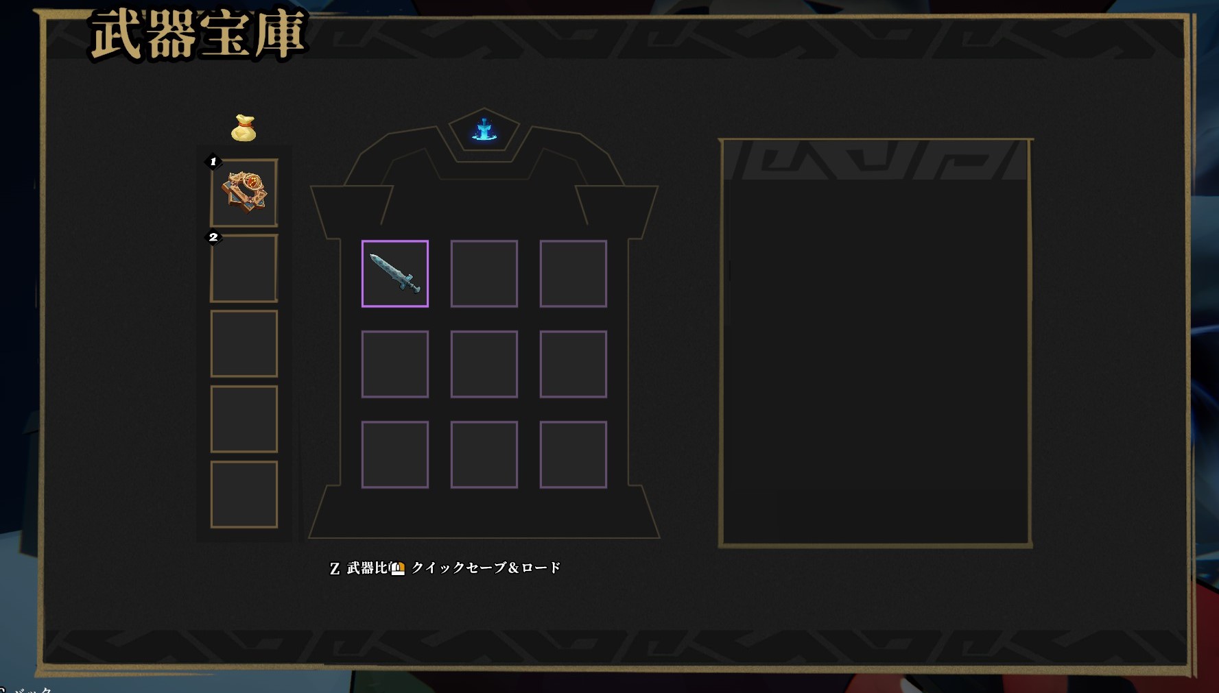 Fキー長押しでフィールドの武器を予備枠に入れられ、武器画面では右クリック長押しで手持ち枠と予備枠の武器を入れ替えできる。